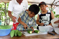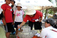 | 大豆を石臼で引いて“ゆしどーふ”作り、やっぱり力仕事は親の出番 |