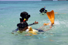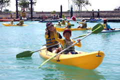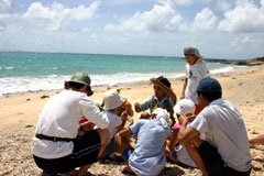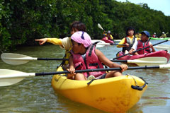 | 1つだけお気に入りの珊瑚を拾い、ネックレスを作りました | 木片と金具で鳥の声を出す「バードコール」作りに奮闘中 | カヌーはお手の物?はじめて見るマングローブの林に興味津々 |