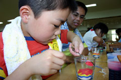 親も子も真剣にジェルキャンドル作り。出来上がりは子どもに軍配!