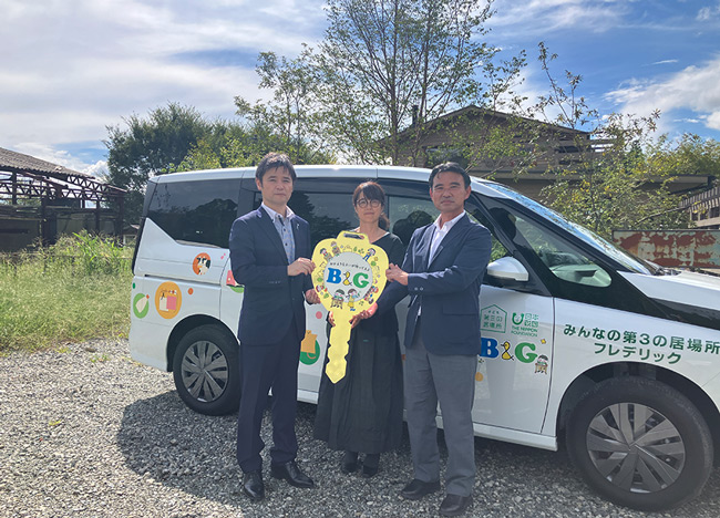 式次第 | 一、開会のあいさつ 一、挨拶(高森町長 草村 大成 氏) 一、挨拶(B&G財団常務理事 朝日田 智昭) 一、送迎車両活用計画 説明 一、報道機関取材・質疑応答 一、送迎車お披露目・記念撮影 一、閉式 |