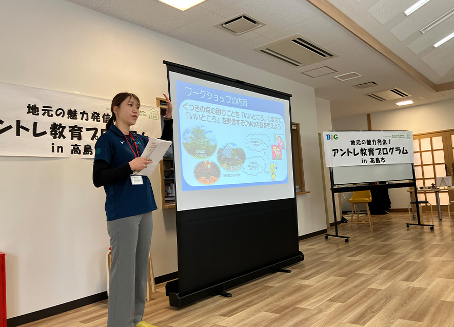 後からは、ワークショップ「くつきの森のいいところを発信するCMの内容を考えよう」を実施した。くつきの森が抱えている課題であるネガティブイメージについてクイズ形式で振り返り、河野氏の講話での「見方を変えること」「発想を転換すること」をヒントに、楽しいイメージとして発信するためのCM内容を考えた。