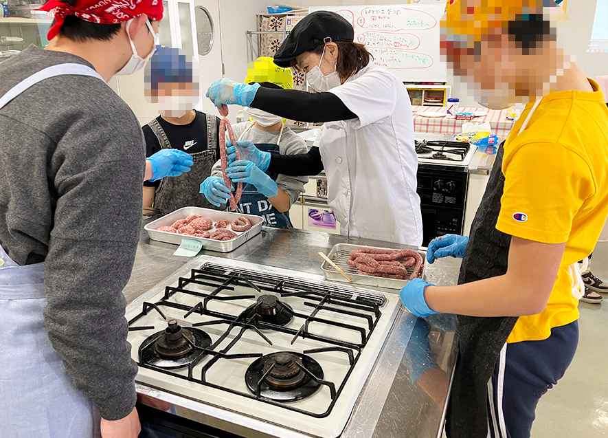 その後、子どもたちは実際にソーセージ作りに挑戦した。豚肉を練り、羊腸に詰める工程に、子どもたちは苦戦しながらも、初めての体験を楽しむ様子が伺えた。