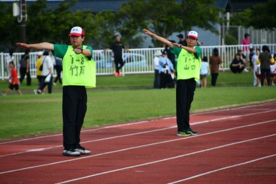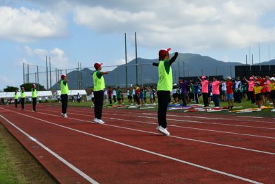 町民体育祭の開会式では、参加者全員で行った準備体操を行います。ここでも研修生が、全参加チームの前でラジオ体操を披露しました。