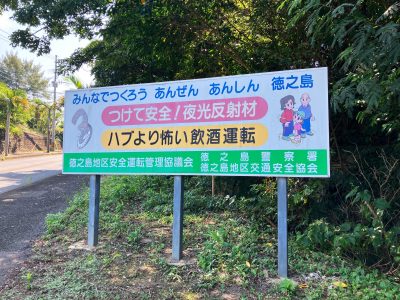 現地でもハブの話題はよく耳にするのですが、実は天城町内を車で走っていると、こんな看板があります。