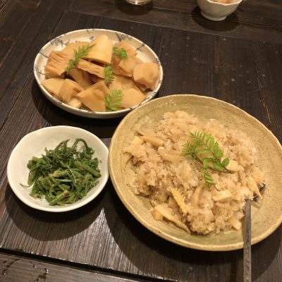 タケノコごはんに煮物、タラの芽などの山菜の和え物