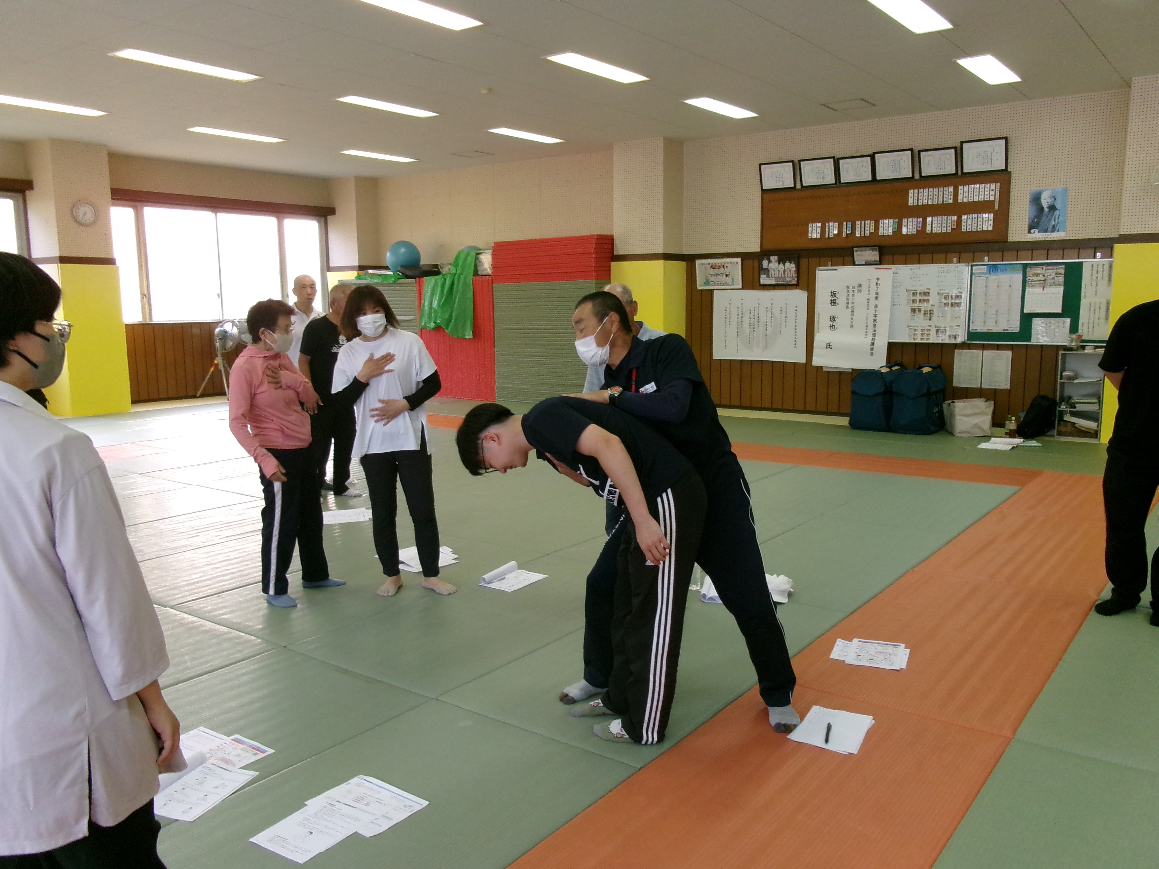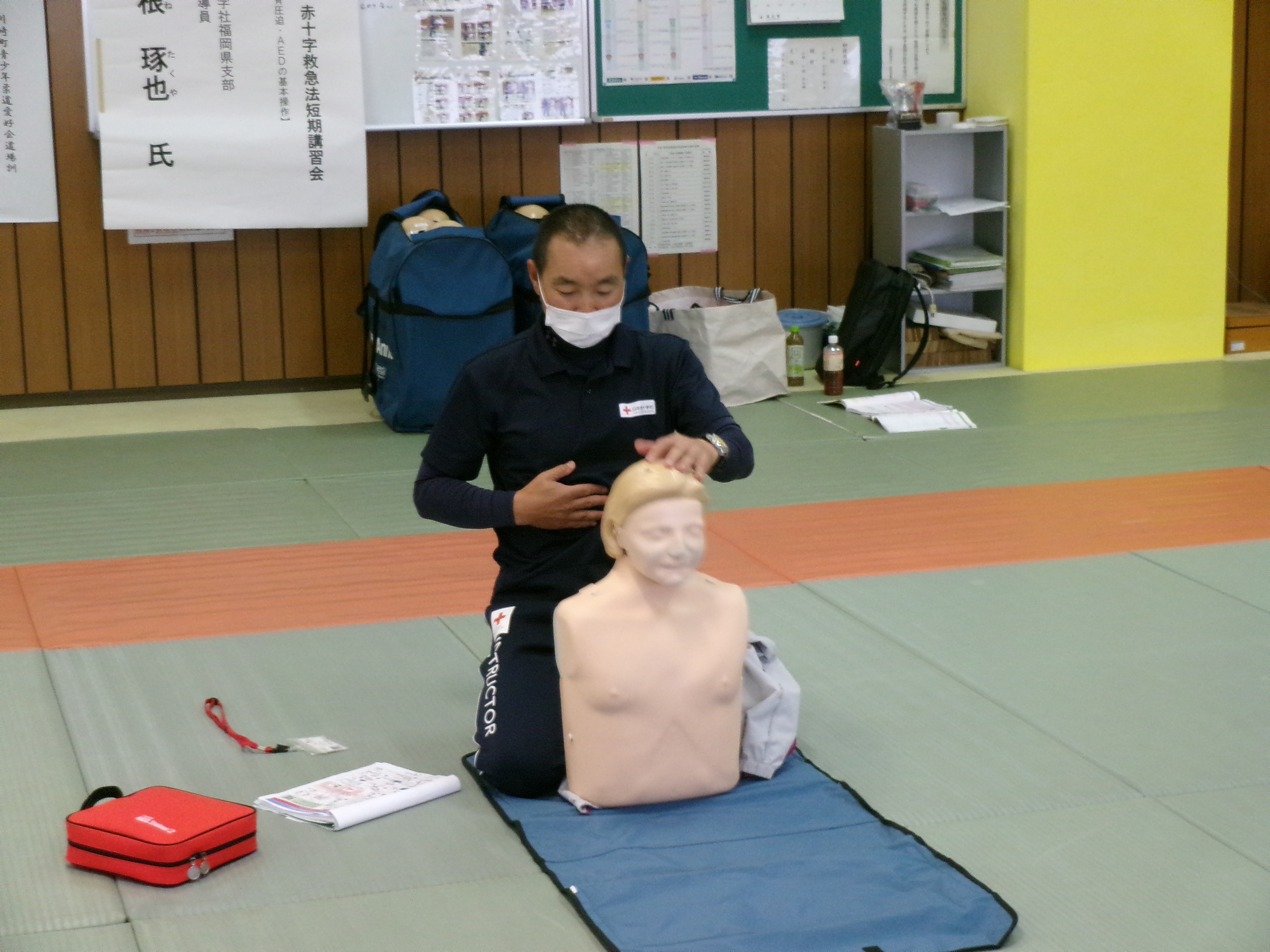 日本赤十字社より講師の方を派遣していただき実施します。講習の内容としては、のどに異物が詰まった際の除去方法や心肺蘇生、AEDの使い方についてを人形等を用いて行います。