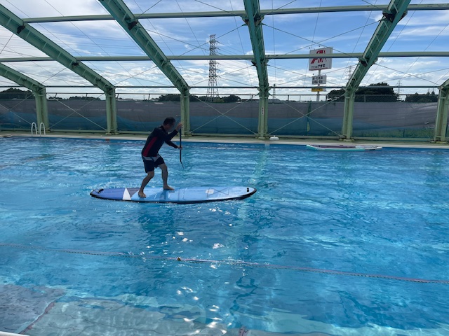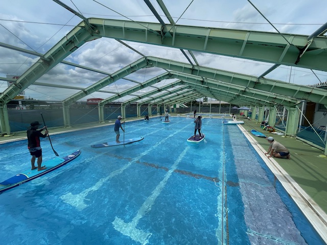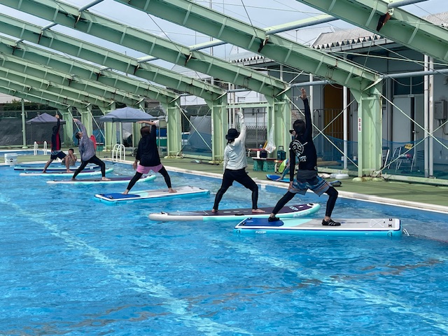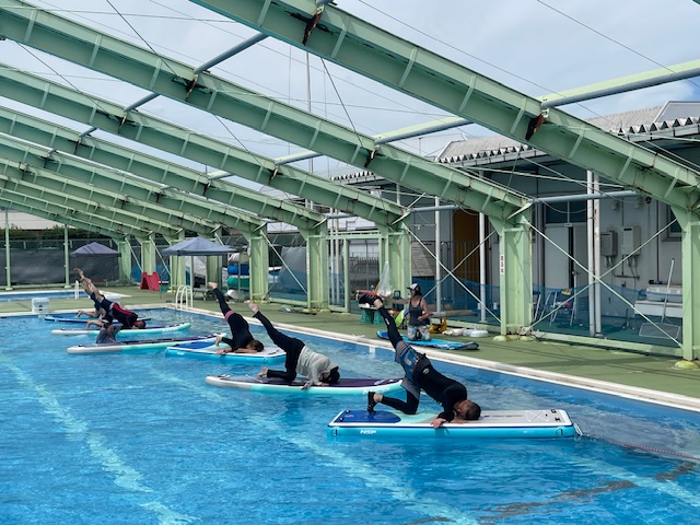 大人のSUP体験教室を開催しました。パドルの漕ぎ方やヨガを行い、最後にタイムアタックを行いました。初心者も経験者も、誰も沈することなく、参加者同士がお互いに応援し合いながら1秒でも早くクリアしようと、楽しみながらも真剣に取り組む姿が印象的でした。
