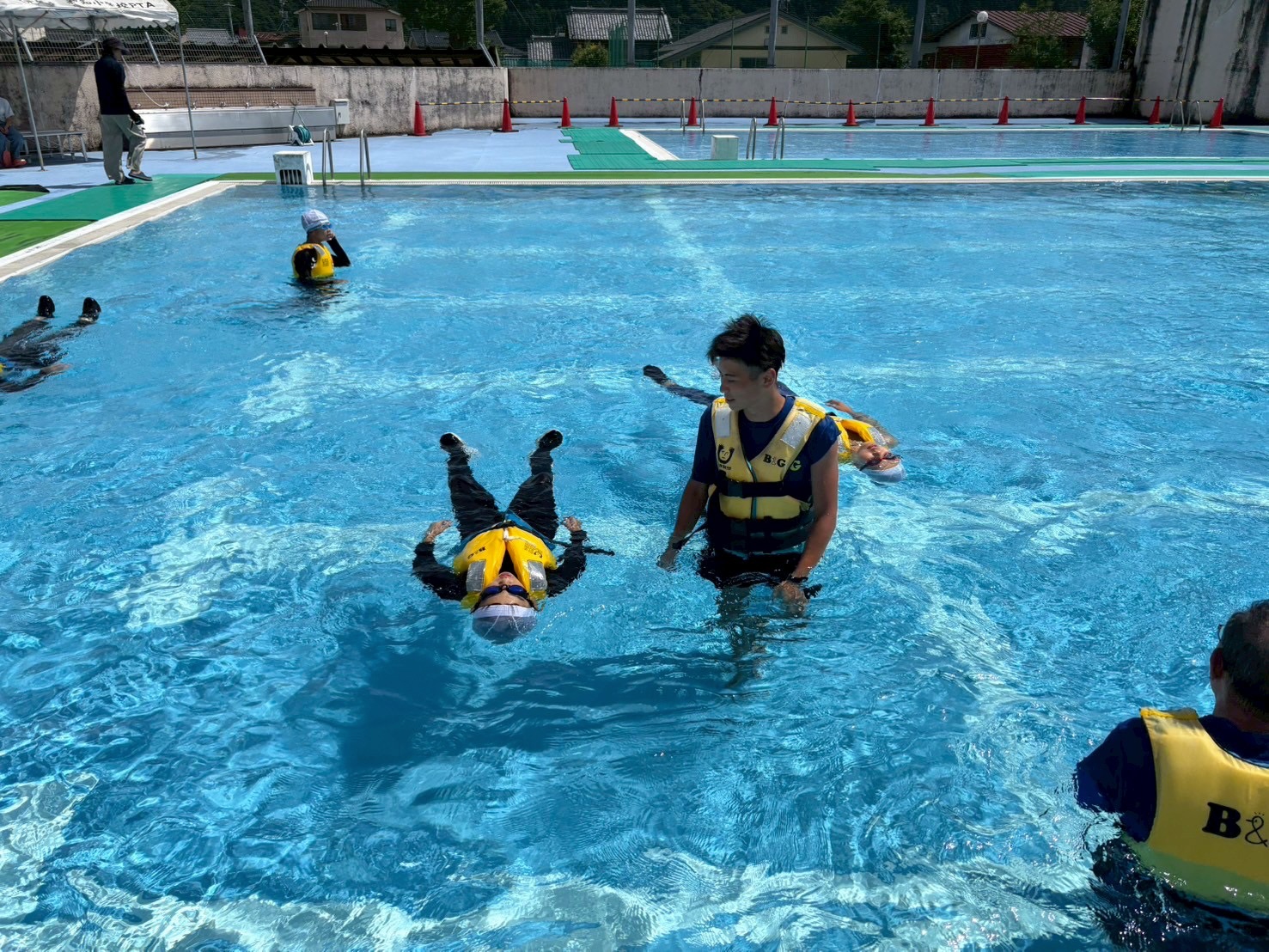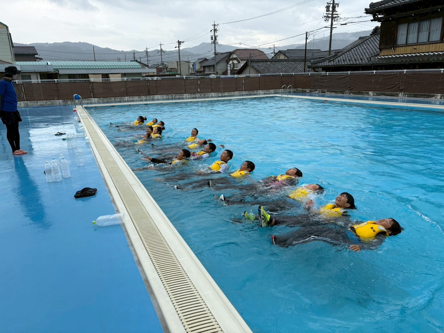 B&G指導員が町内の各小学校プールに出向き、学校授業の一環として、背浮きやライフジャケットについての実技や要救助者を発見した時や自身が要救助者になった場合の対応方法などの勉強(指導)をしました。