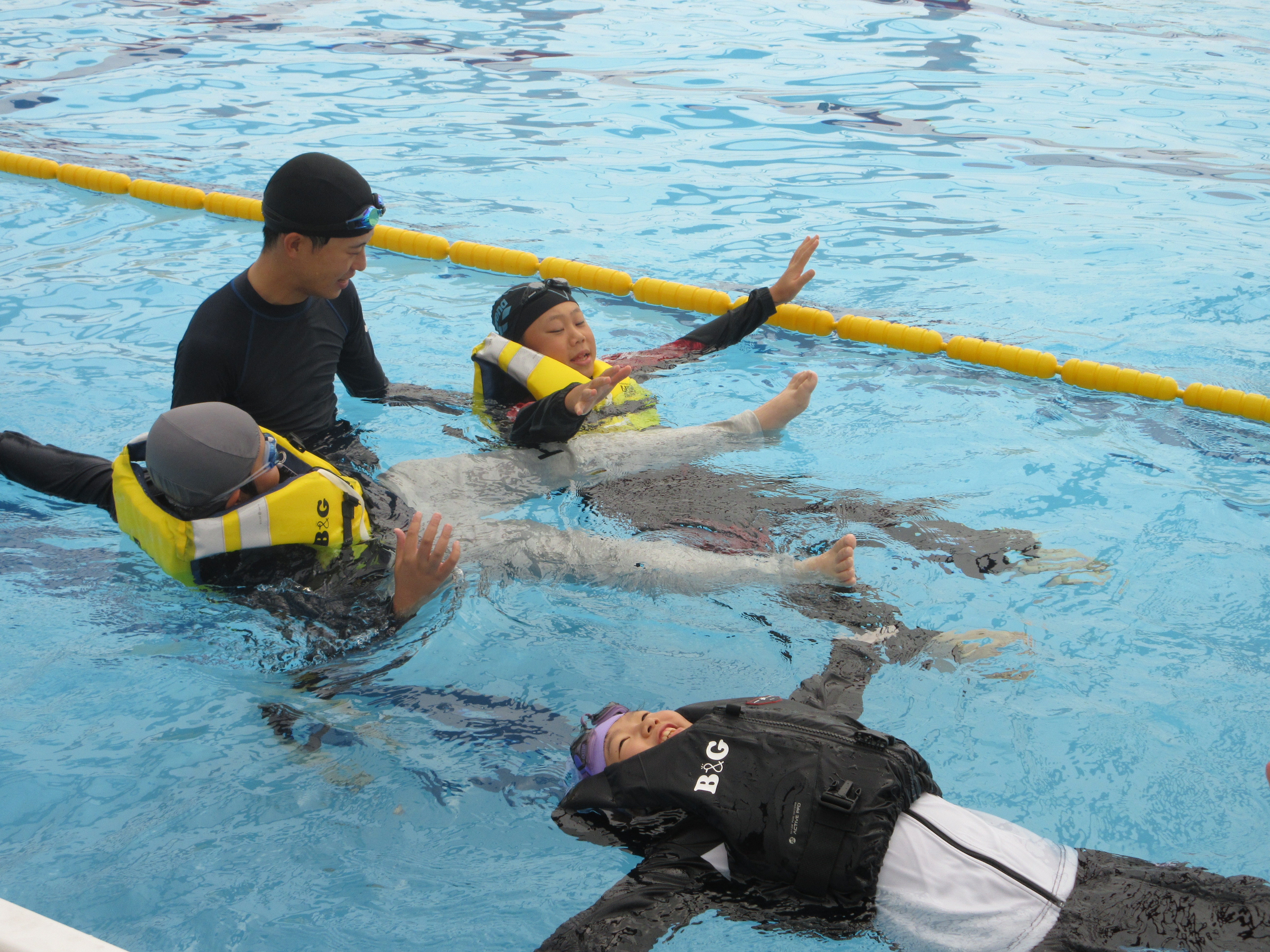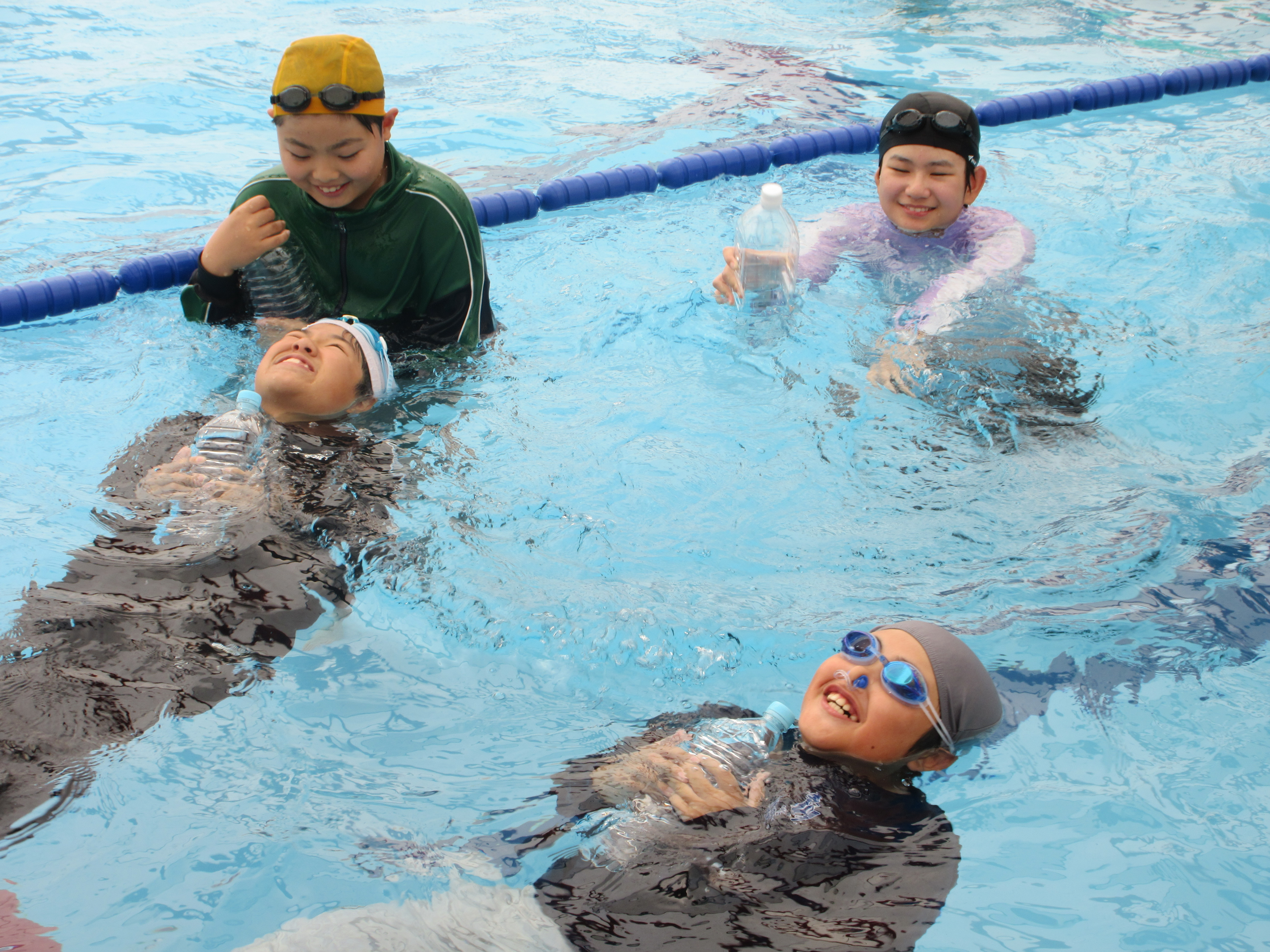 ペットボトル浮き・背浮き・ライフジャケット浮遊体験・着衣水泳を実施しました。