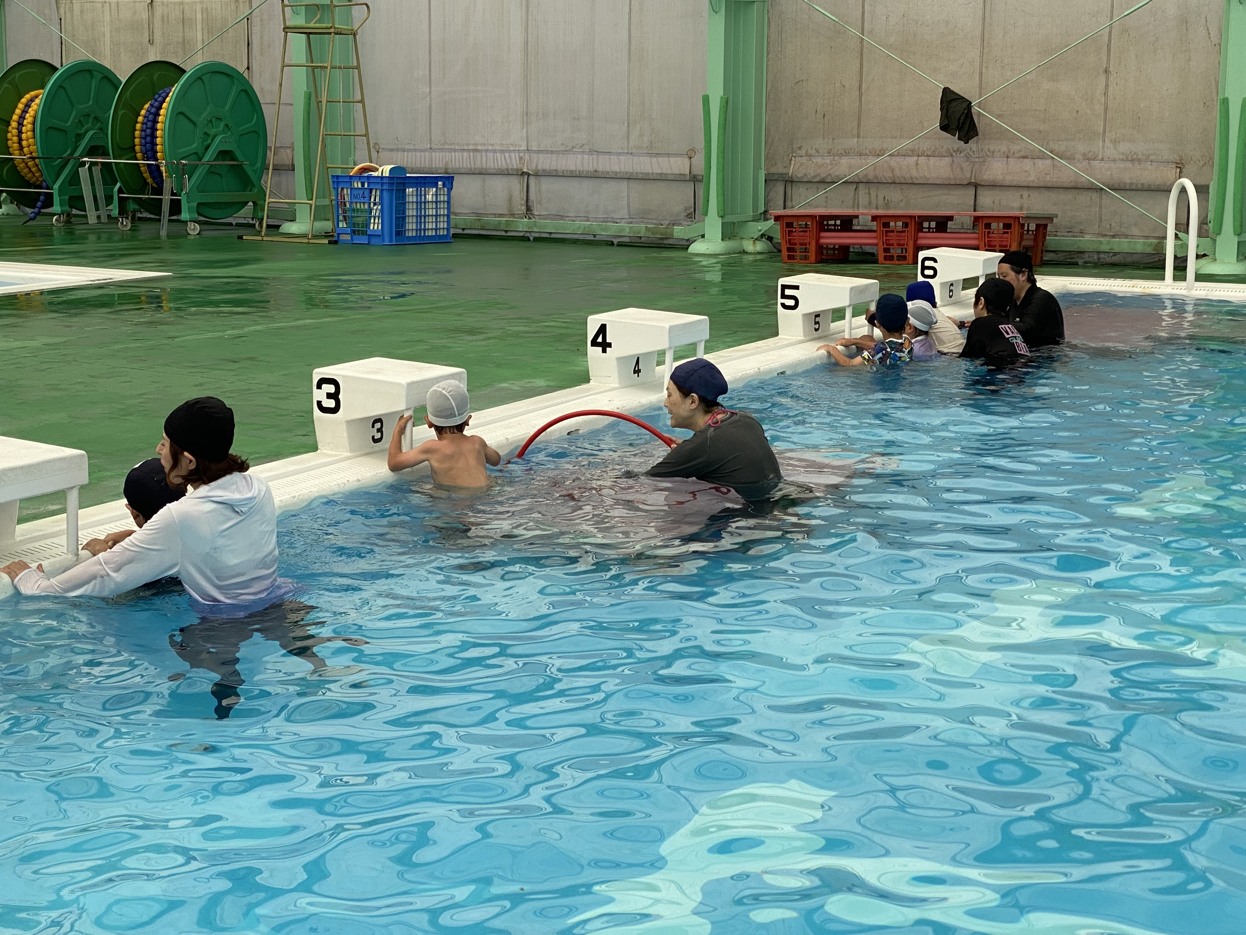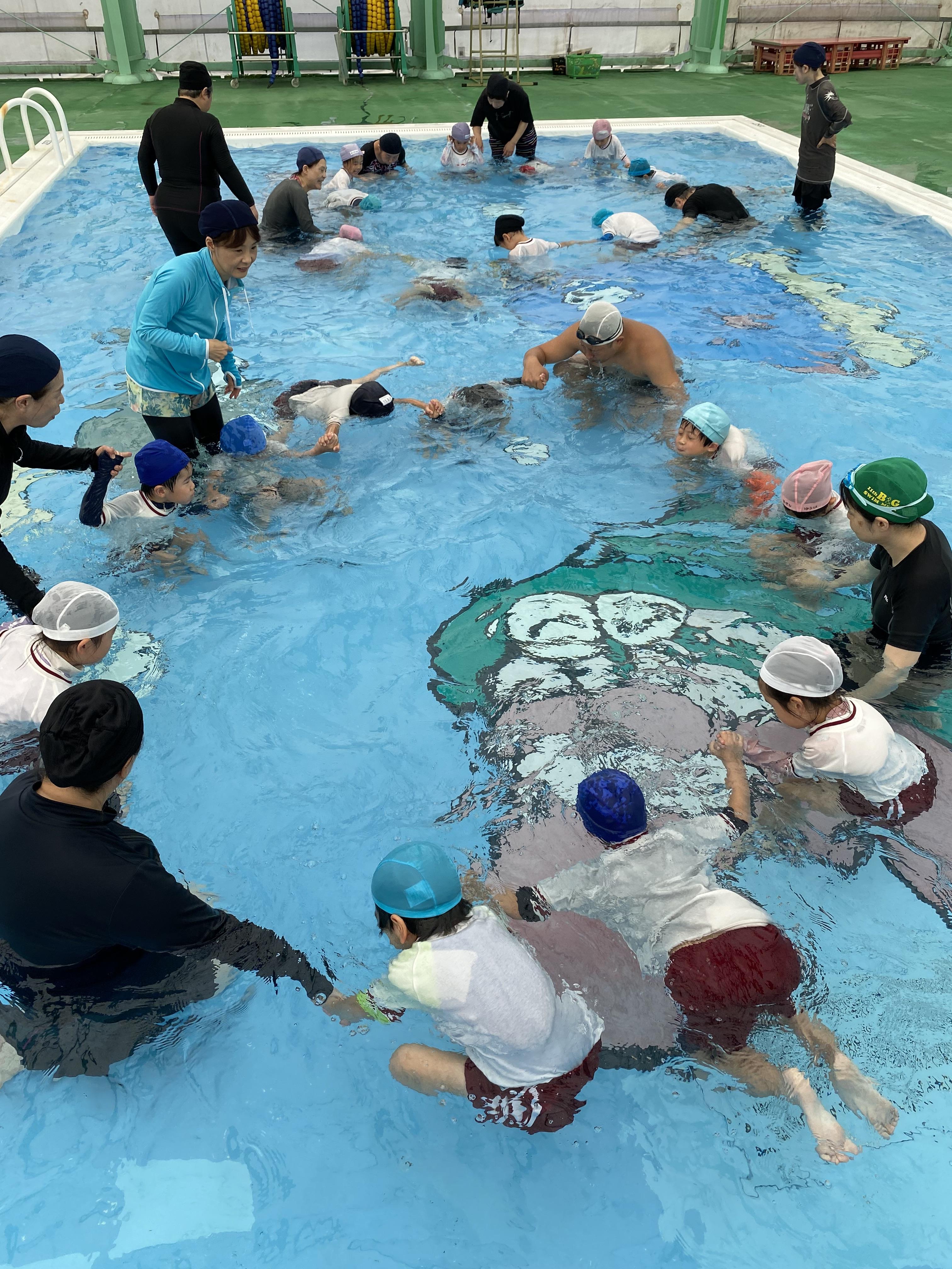 水慣れ、息こらえ、ワニさん歩き、鼻から息を吐くブクブクパ、バタ足、着衣水泳、力試し 水に浮いてみる。など6日間実施。