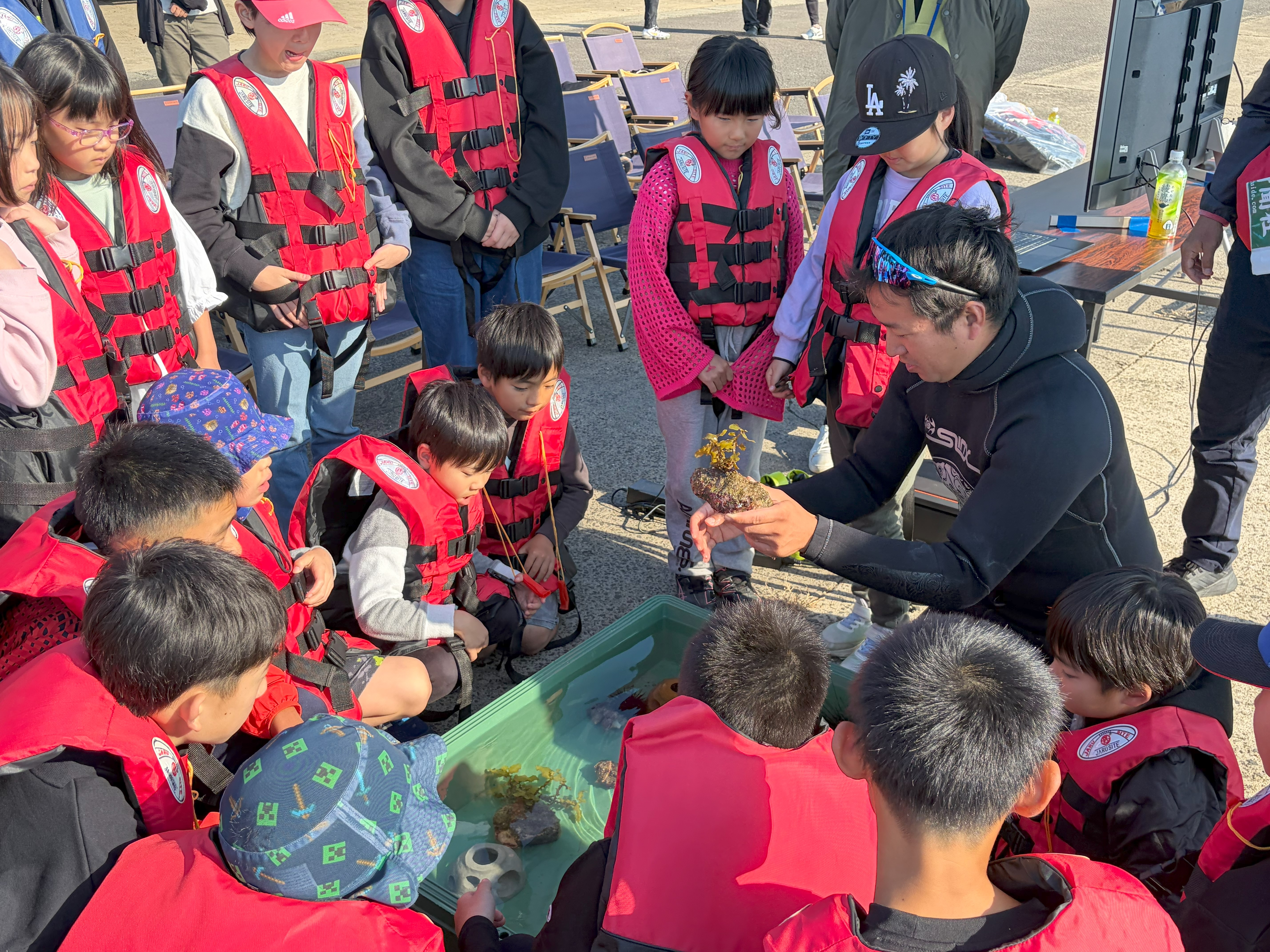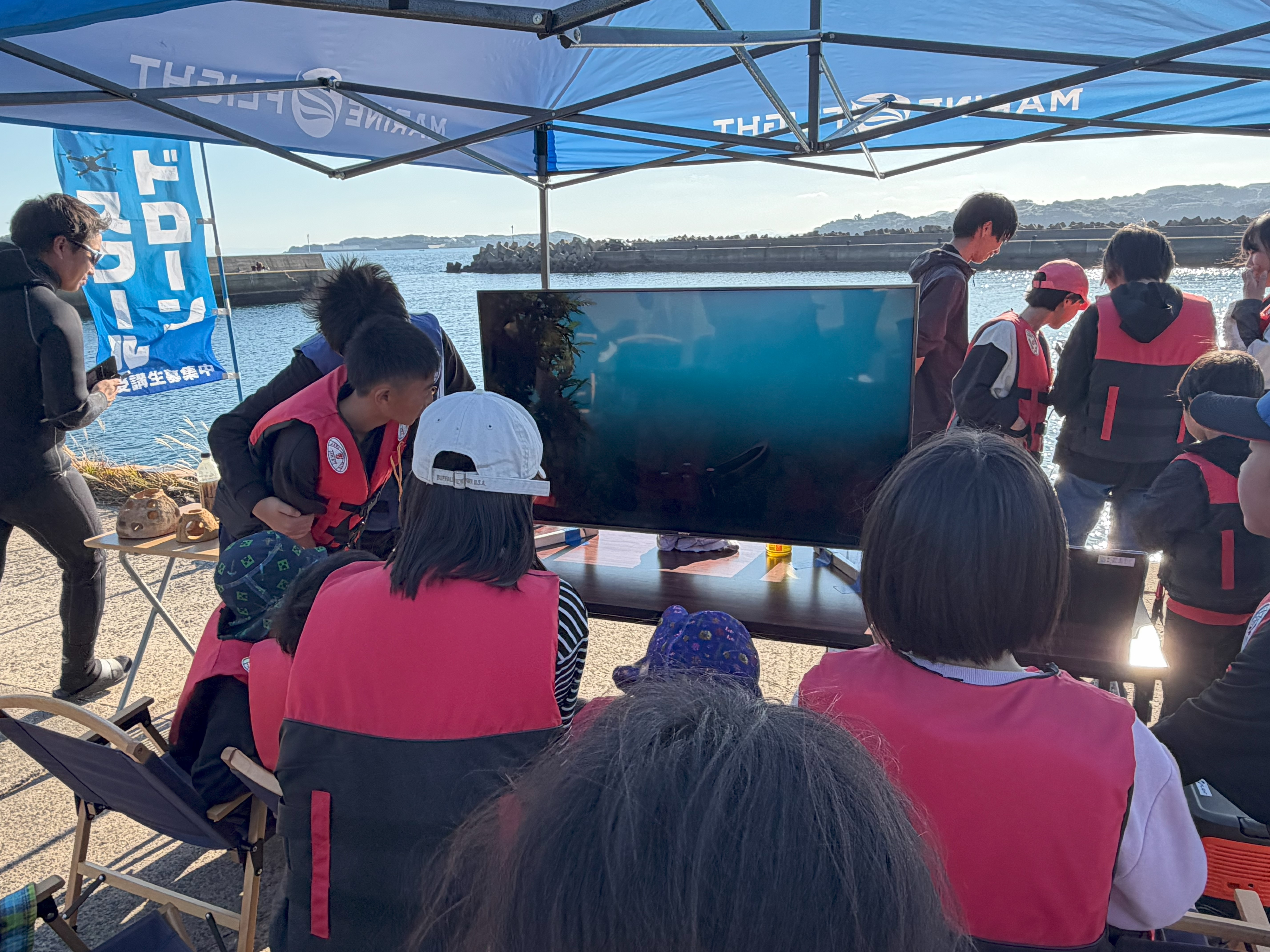 自分たちが住む島の海の中の様子を水中ドローンで観察してみよう!磯焼けの実態を説明する中で、実際に生育している海藻、むらさきウニ、がんがぜウニ、サザエ、三角みな等に直接触れ観察し、ウニにいたっては食する。という体験まで行った。水中ドローンの操縦では、モニターで海中を観察しながら操縦。ドローンのアームで海藻等を掴み取ることにもチャレンジできた。空撮のドローンの操縦も体験でき、空から見た地元の海の美しさを感じることができ、参加者からは「もっと海のことを知りたい」といった感想が多く聞かれた。