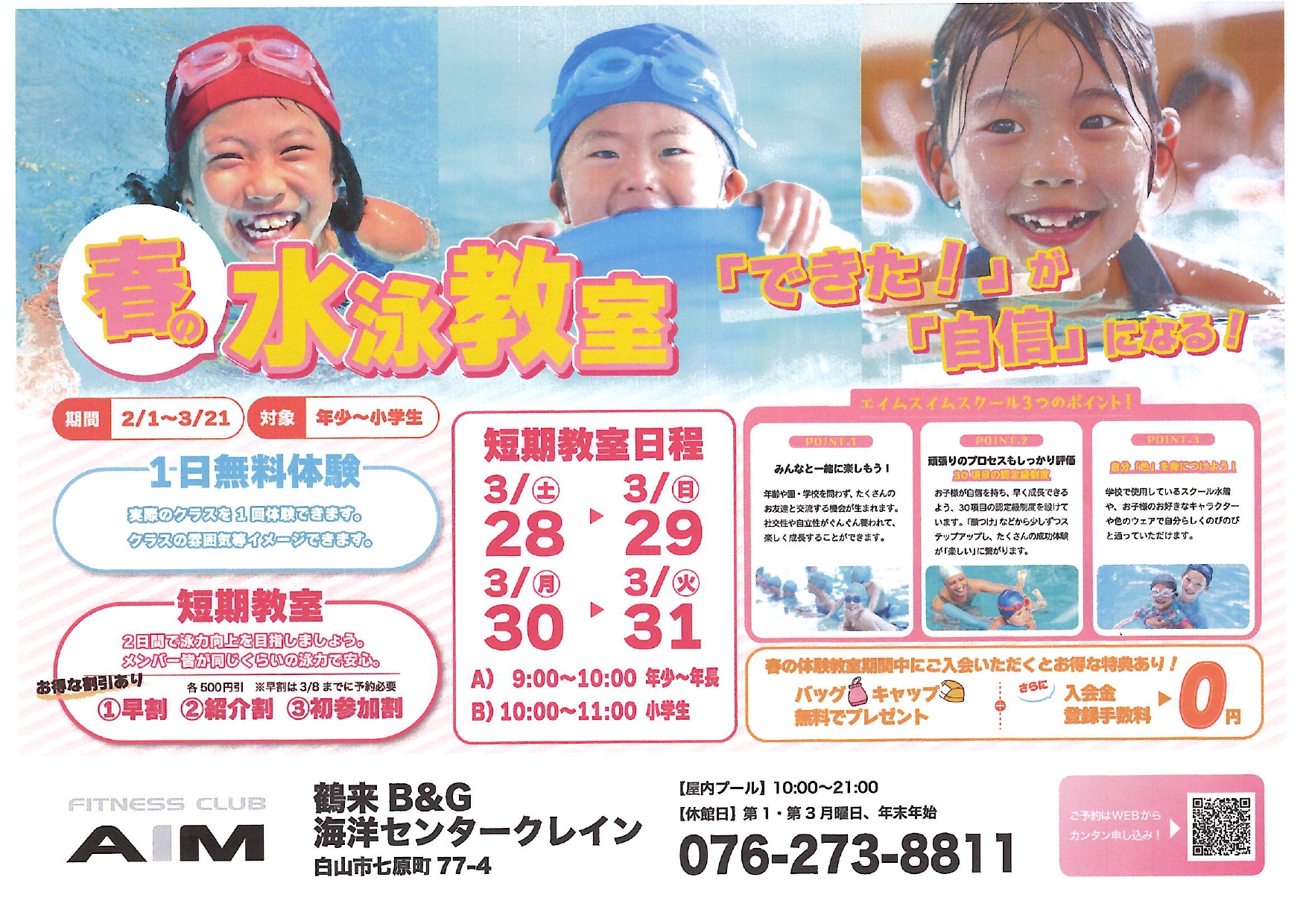 石川県 白山市 春の短期水泳教室内容:教室・研修会