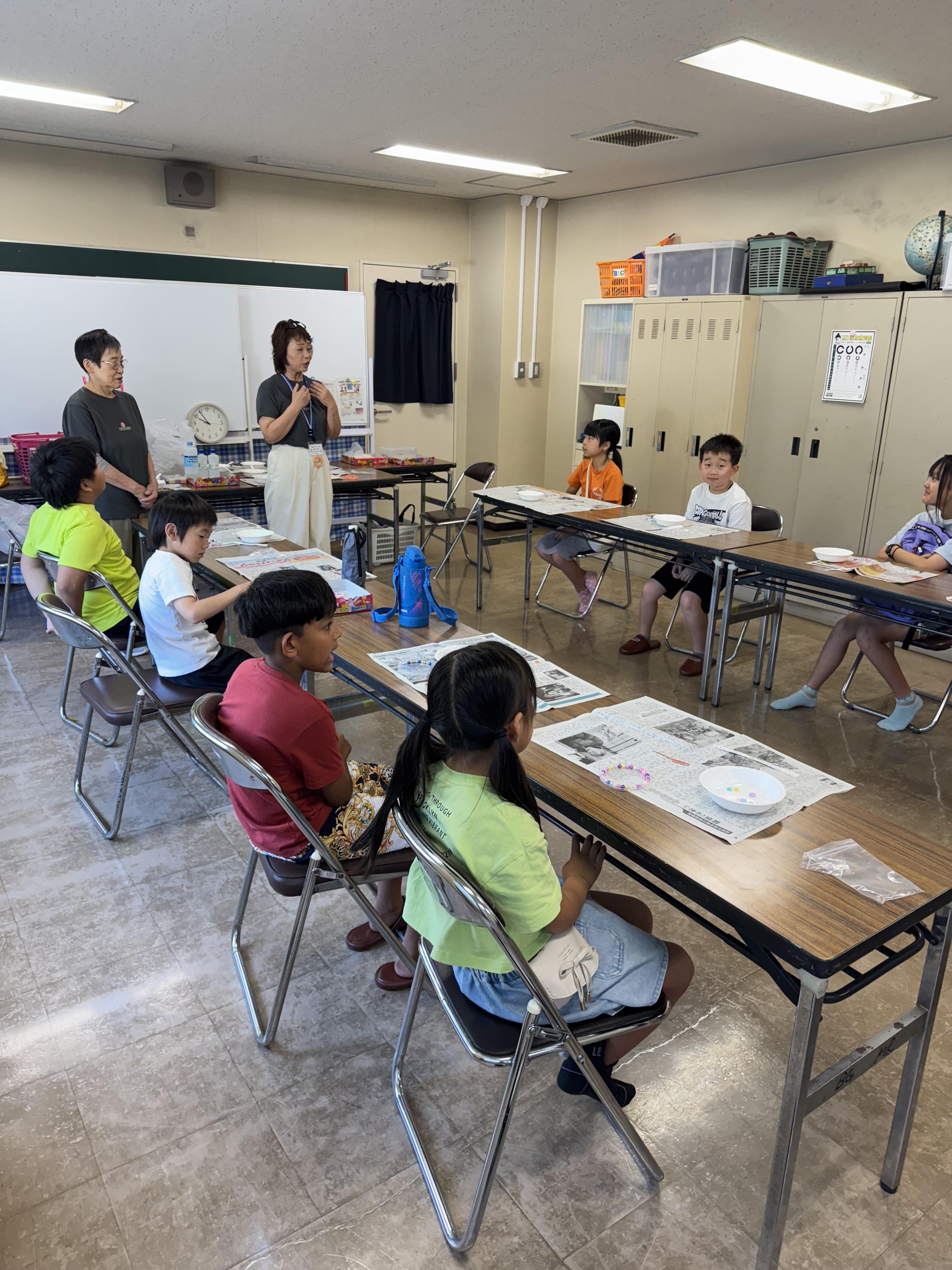茨城県 五霞町 BG塾 サンキャッチャーを作ろう!子ども達は、好きな色のビーズや飾りを選び思い思いのサンキャッチャーを作っていました! ヨーグルトの蓋に飾りを敷き詰め、洗濯のりで固める簡単すてきにできるものです!