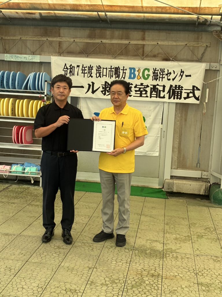 岡山県 浅口市 浅口市鴨方B&G海洋センタープール救護室配備式を実施公益財団法人B&G財団より、熱中症対策における特別支援事業として、鴨方B&G海洋センタープールに冷暖房を備えた救護室を設置。併せて救護備品を配備していただきました。 救護室配備…