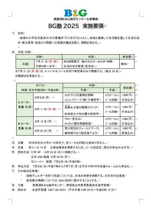 栃木県 那須烏山市 那須烏山市海の日カヌー&SUP体験&BG塾2025地域の小学生の夏休み中の居場所づくりを行うとともに、地域と連携した各活動を通して水辺の安全教室・郷土教育・食品ロス問題への意識の醸成を図り、理解を深める。 内容:海や川での体験/自然体験/スポーツ大会・イベント/健康関連/環境学習/交流事業