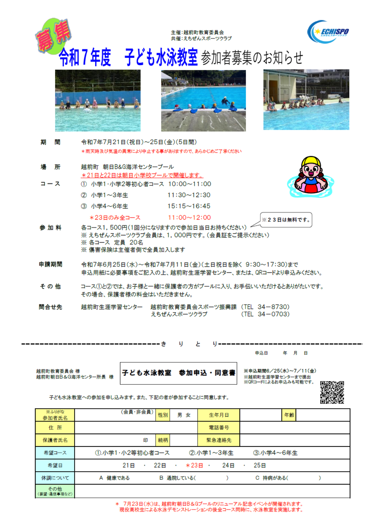 福井県 越前町 令和7年度子ども水泳教室小学生を対象に、水泳の基礎を楽しみながら学び、体力の向上を目指す教室です。学年ごとにコースが用意してありますので、自分に合ったコースを選んで参加できます。 内容:健康関連/教室・研修会