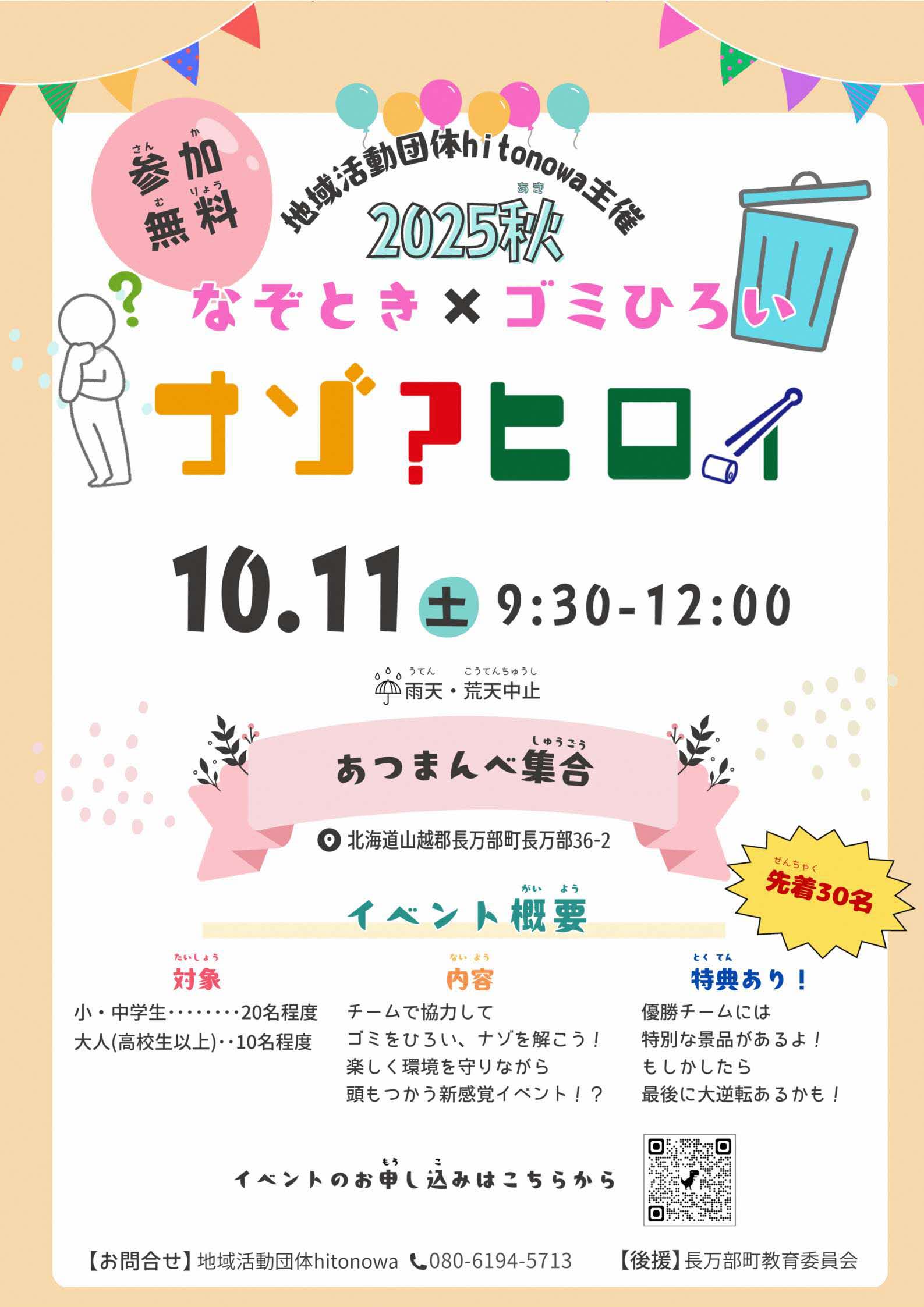 北海道 長万部町 ナゾ?ヒロイ地域活動団体hitonowa&東京理科大学長万部キャンパス学生有志が主催、長万部町教育委員会が後援となり、ごみ拾いと謎解きをかけ合わせ、ゲーム感覚で楽しみながら町を大切にする気持…