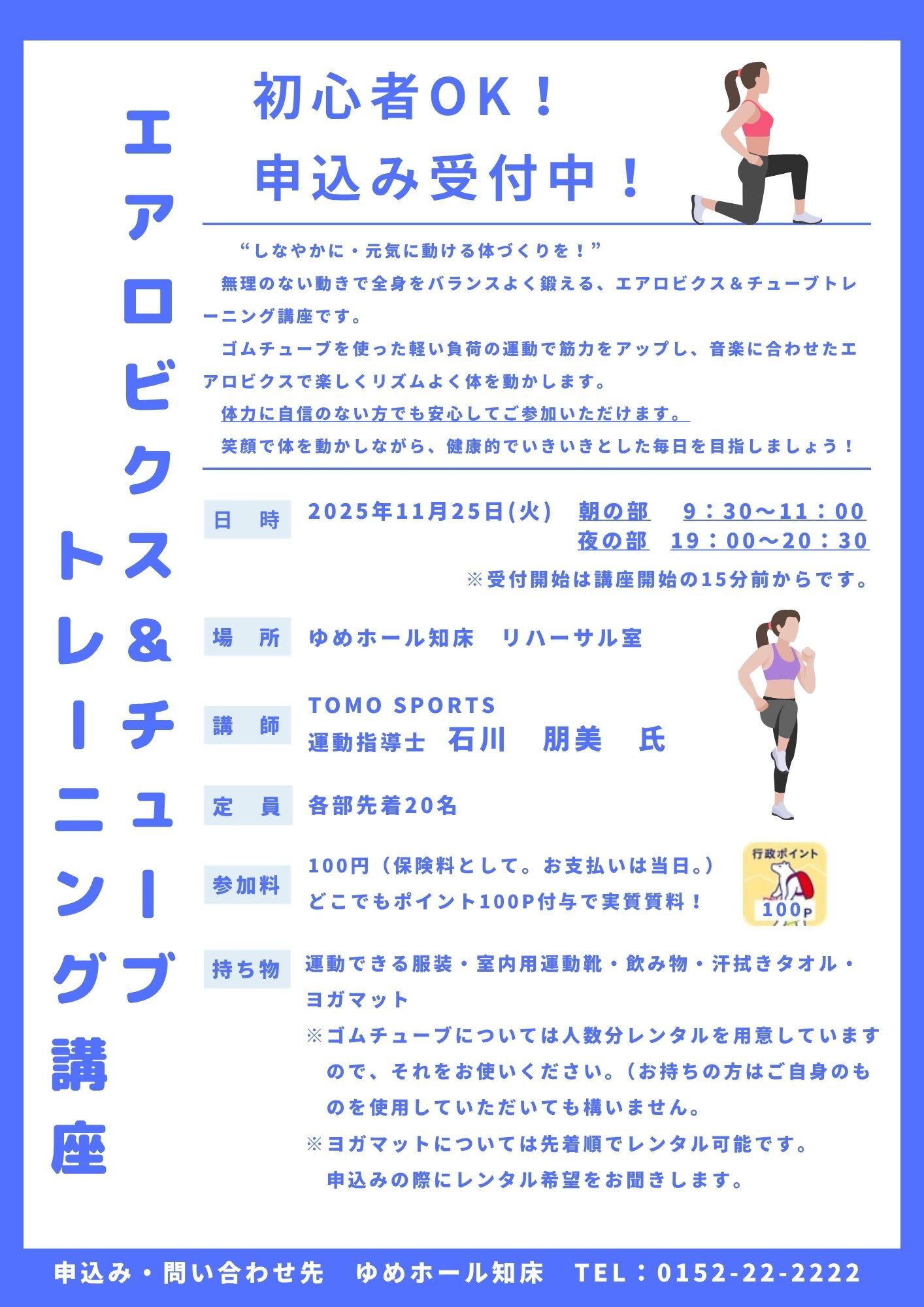 北海道 斜里町 エアロビクス&チューブトレーニング講座健康運動指導士としてご活躍されている専門の講師から、エアロビクスとゴムチューブを使ったトレーニング方法を学ぶことができます! また、朝の部と夜の部の2部構成となっており、参加者…