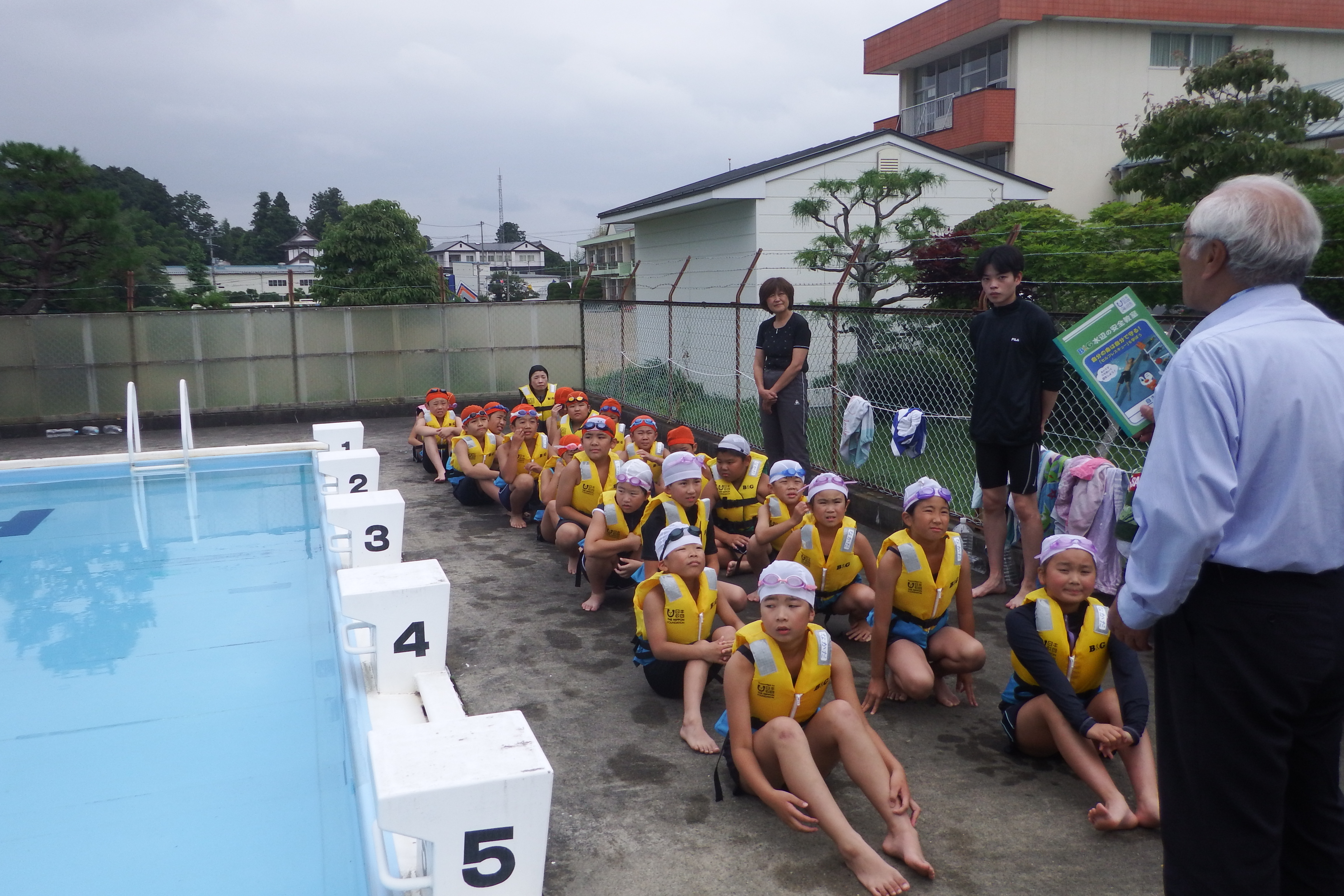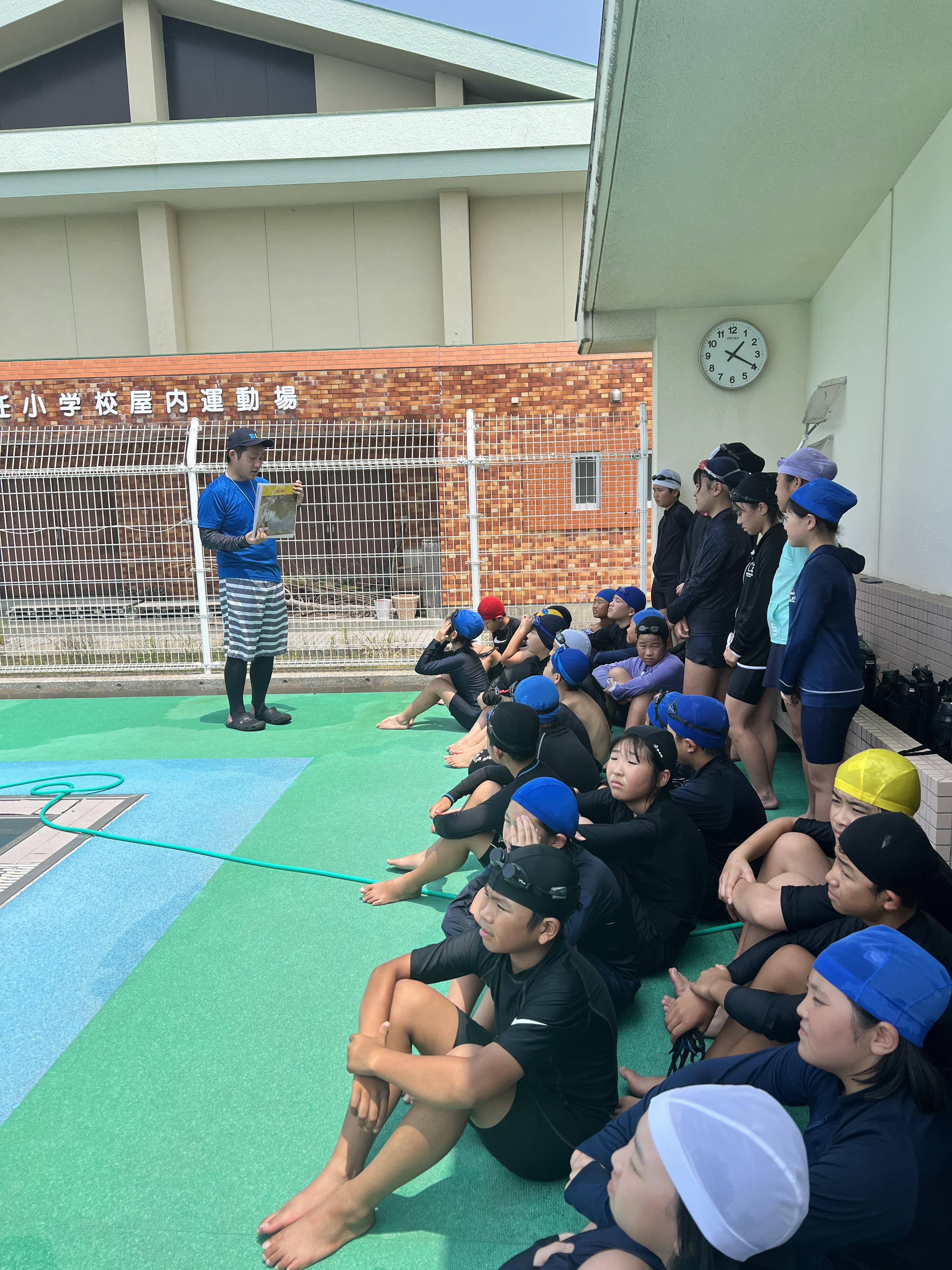 福岡県 大任町 水辺の安全教室開催大任町今任小学校プールで、5・6年生を対象に水辺の安全教室を開催しました。 紙芝居で水に対しての勉強をしたりしました。 ライフジャケット着用、ペットボトルを使っての背浮き体験…