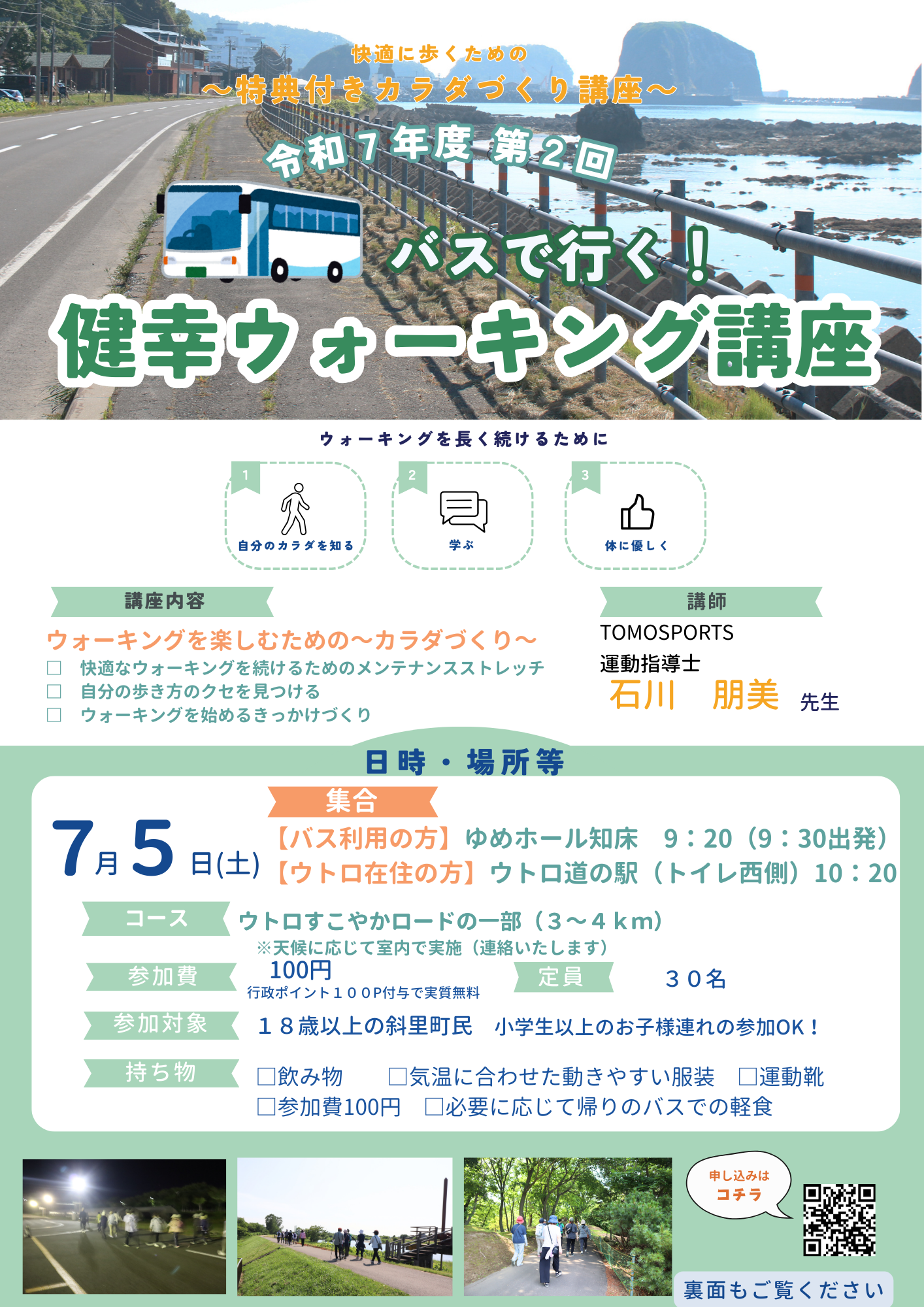 北海道 斜里町 第2回健幸ウォーキング講座運動指導士として活躍されている講師をお招きします。 みんなで無理せず、自分のペースで楽しく歩きましょう。 今回はバスでウトロまで移動し初となる、ウトロすこやかロードをウォーキ…