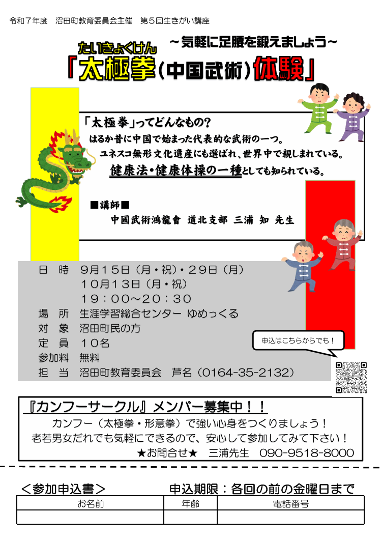 北海道 沼田町 太極拳(中国武術)体験内容:健康関連/教室・研修会