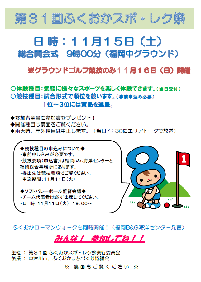 岐阜県 中津川市 第31回ふくおかスポ・レク祭中津川市ふくおか地区最大のスポーツイベントです。 体験種目は、事前申込不要で気軽にスポーツ吹矢や弓道を体験できます。 競技種目は、ソフトバレーやペタンクなど順位を競います。