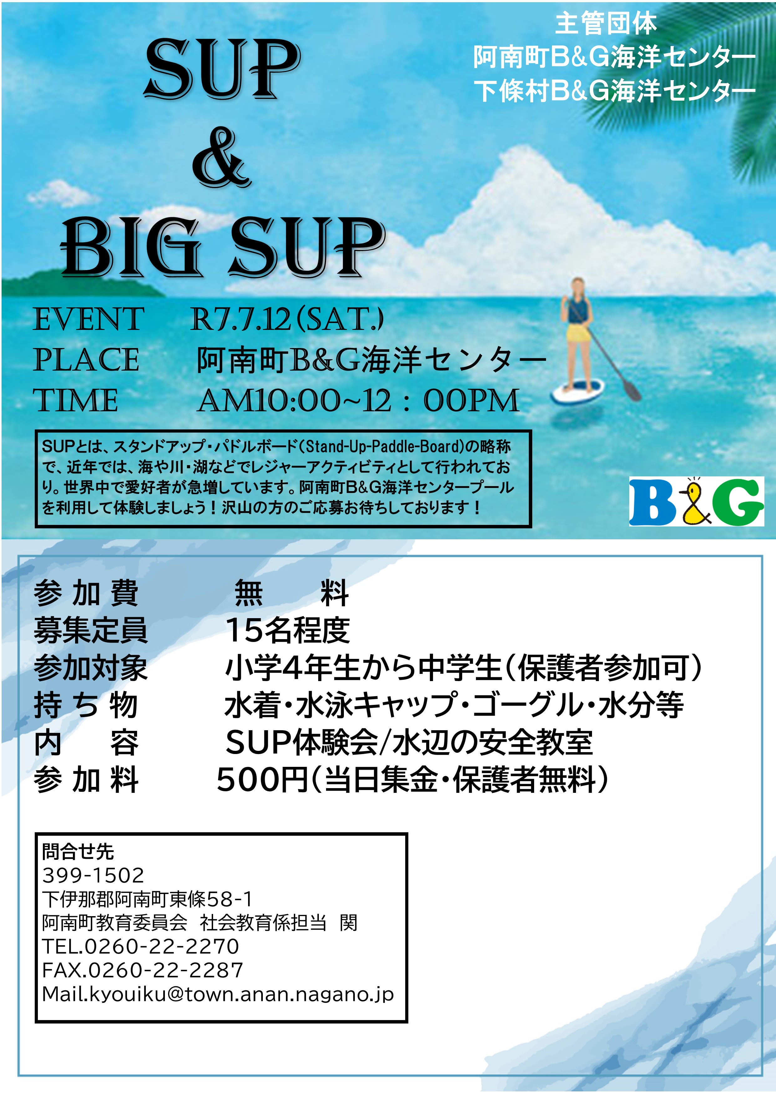 長野県 阿南町 阿南町B&G海洋センターエンジョイスクエアエンジョイスクエア事業として実施、飯田下伊那のこどもを対象に実施! SUP体験会をメインで海レク体験と安全教室を実施!