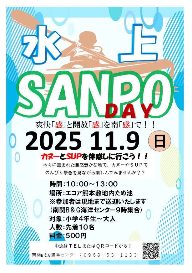 熊本県 南関町 水上SANPO DAY木々に囲まれたため池でのカヌー体験。涼しくなった環境で、のんびりとカヌーを漕ぎながら自然を満喫してみませんか?