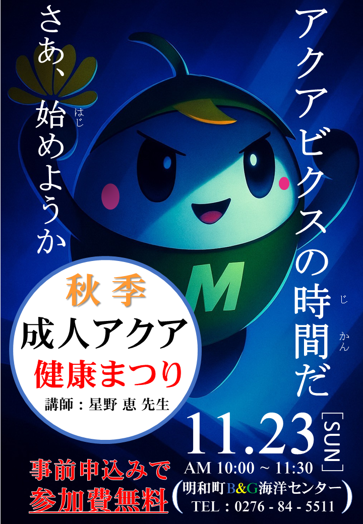 群馬県 明和町 秋季成人アクア健康まつりプロの講師をお招きしてのアクアビクス教室を開催します♪ 事前申し込みで参加費無料‼️ 初めての方も無理なく楽しめますので、この機会にぜひご参加ください