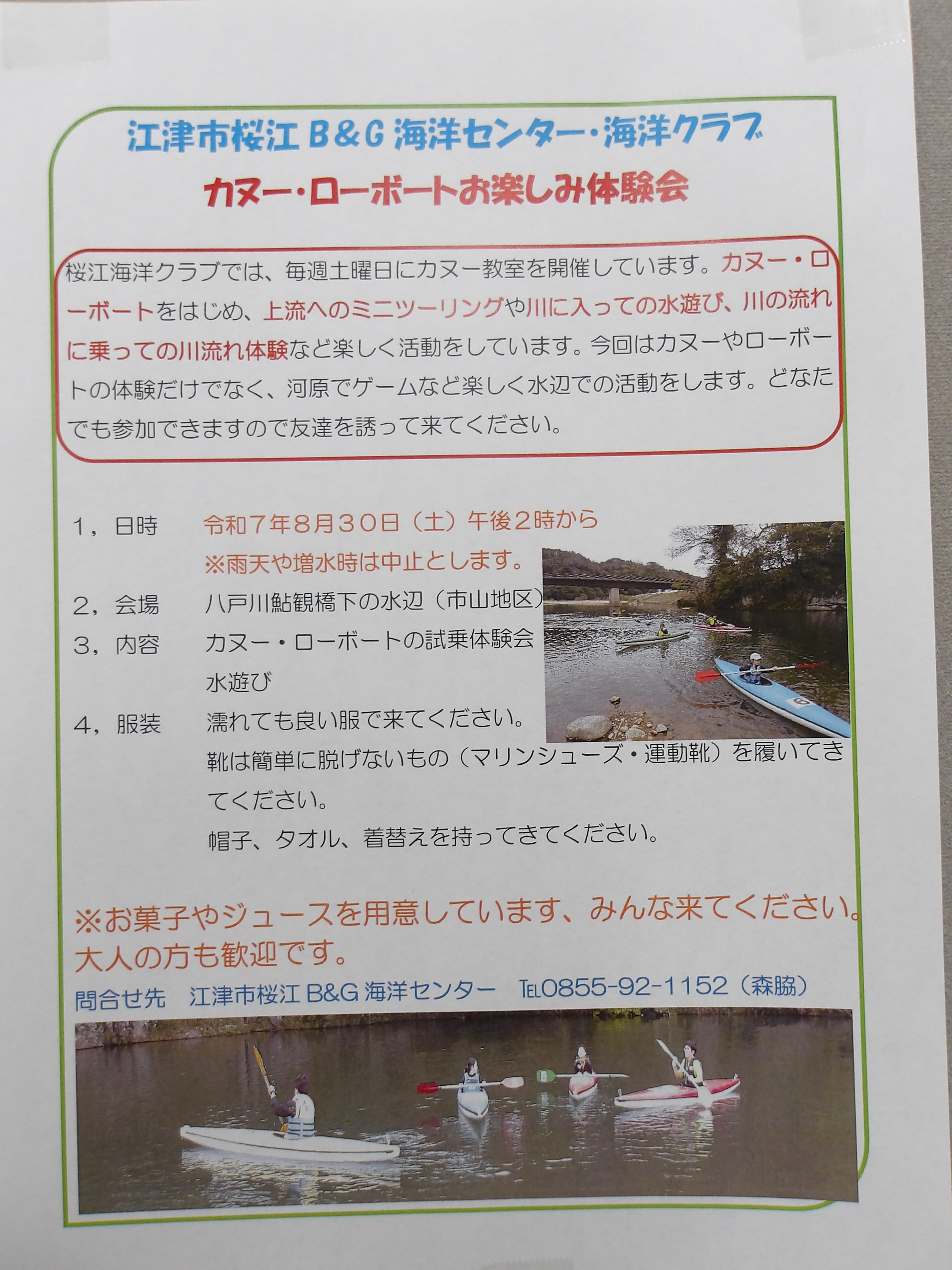 島根県 江津市 江津市桜江B&G海洋センターカヌー教室今年もカヌー教室を開始しました。自然い囲まれた桜江町の八戸川でカヌーを楽しみましょう。大人の方の参加も歓迎します。