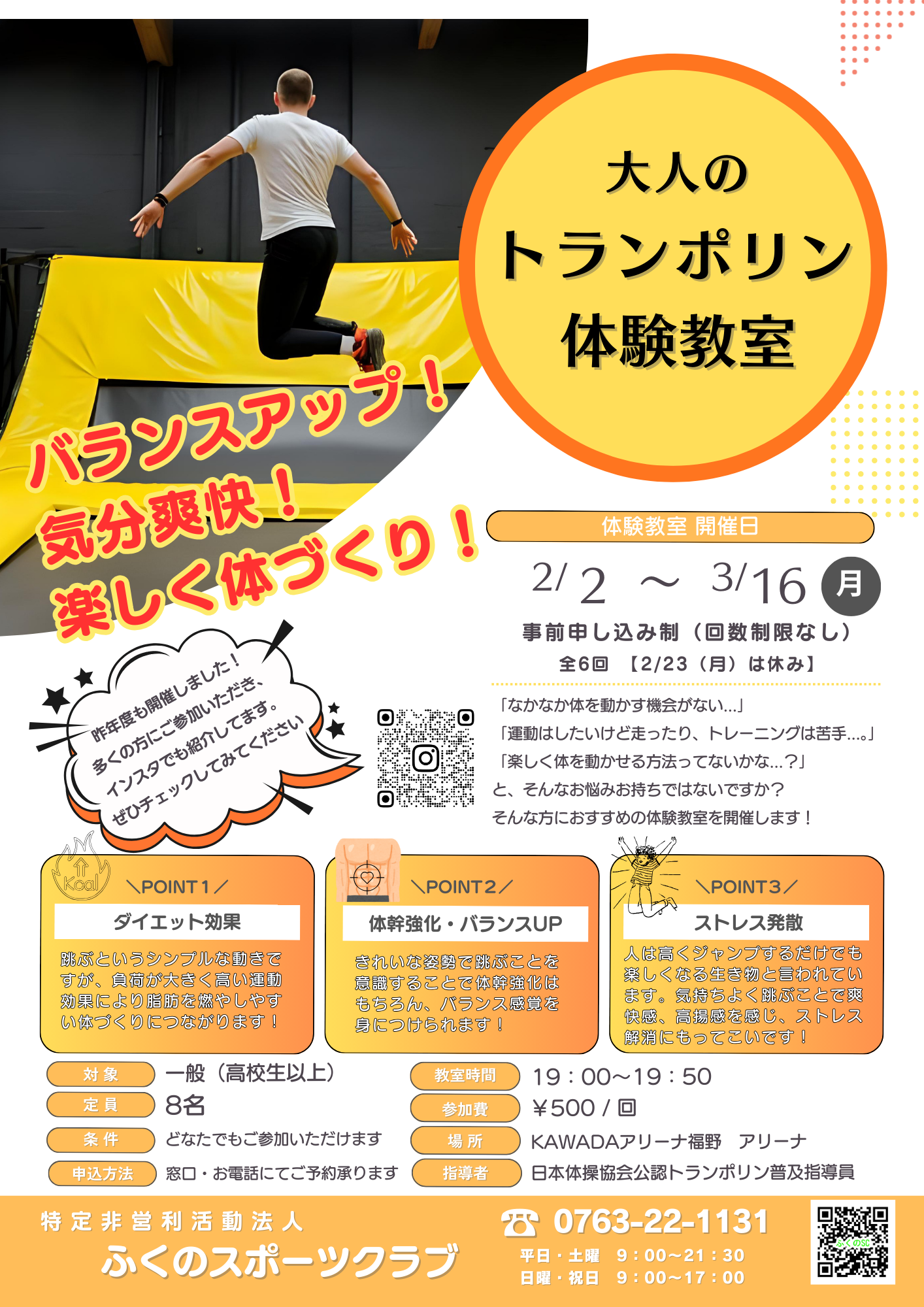 富山県 南砺市 大人のトランポリン体験教室冬場の運動不足解消に非日常空間での運動を楽しみませんか