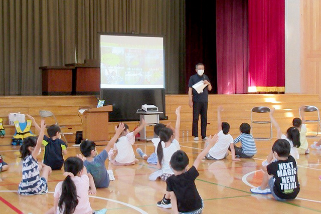昨年は公民館の青少年教育事業の一環で、近隣の小学校の授業時間に「水辺の安全教室」を実施しました。授業時間を割いていただき、プロジェクターでスライドを映して「自分の命は自分で守る」ことの大切さを伝えました。