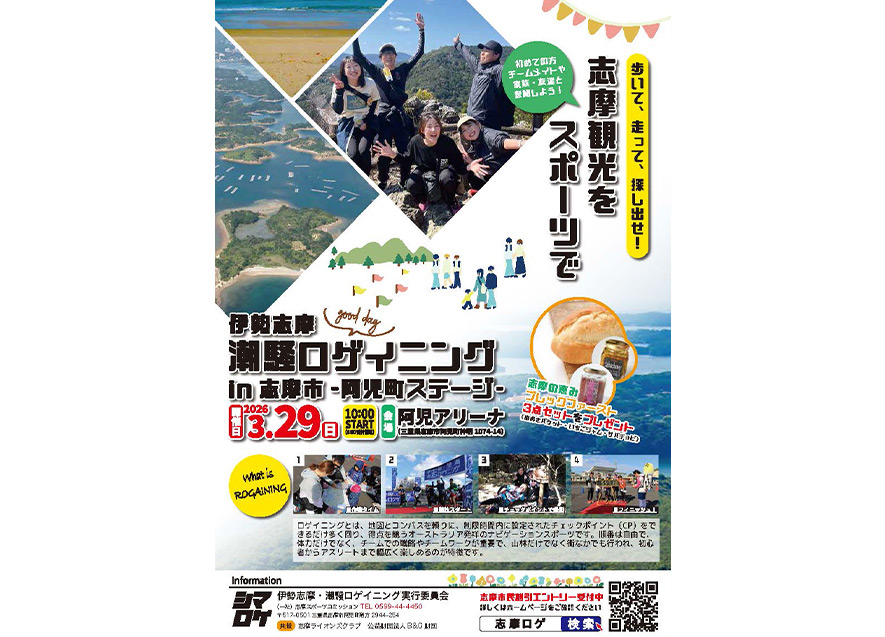 3月29日(日)に三重県志摩市にて『潮騒ロゲイニング in 志摩市―阿児町ステージー』を開催いたします。志摩市庁舎のある阿児町を舞台に、志摩市の美しい海岸線沿いのスポットはもちろん、志摩市の様々な魅力に気づくことができるイベントになっています。志摩市の美しい海岸線沿いのスポットはもちろん、志摩市の様々な魅力に気づいていけるイベントになっています。